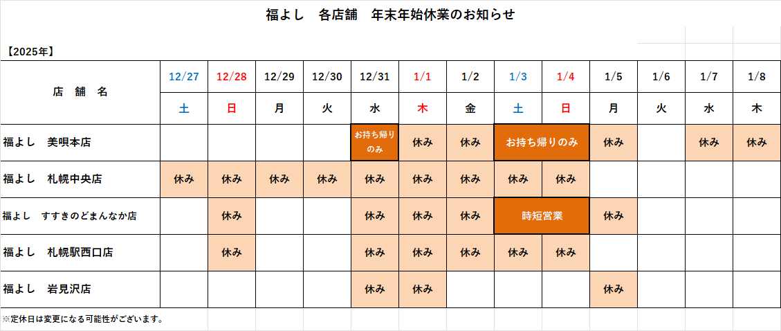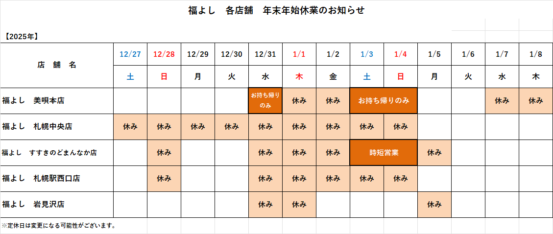 各店舗の年末年始の休業日につきましては、以下の通りとなります。